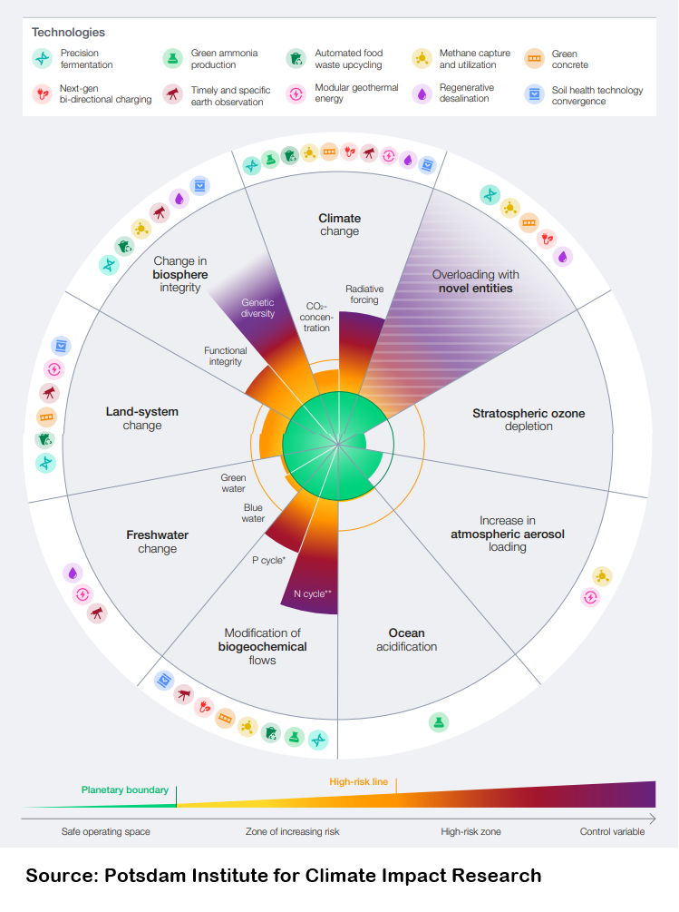 With seven of Earth’s nine planetary boundaries – the natural systems that keep our planet stable – having been breached, the World Economic Forum’s 10 Emerging Technology Solutions for Planetary Health Report highlights how innovation can help restore balance within these limits. Advancements in technology have a crucial role to play in efforts to transform the world economy back within the safe operating space of planetary boundaries. They can substitute planet-damaging technologies (such as transitioning away from fossil-fuel-based energy and moving to green electric solutions), enable more effective monitoring of environmental changes, mitigate damaging impacts and have the potential to help restore the integrity of some of our planet’s vital systems. The technologies in this report offer promising tools as part of the broader transformation needed to move back towards a safe operating space within planetary boundaries, and represent a starting point for collective action – offering approaches with the potential to accelerate progress, inspire collaboration and help secure a sustainable future.